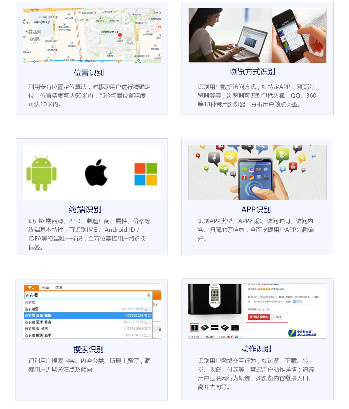 基于Hadoop/Spark架構的大數據處理平臺,利用數據采集平臺收集的相關數據,對用戶相關行為進行分析、聚類、匯總、統計,最終形成用戶位置識別、瀏覽方式識別、終端識別、APP識別、搜索識別、動作識別。