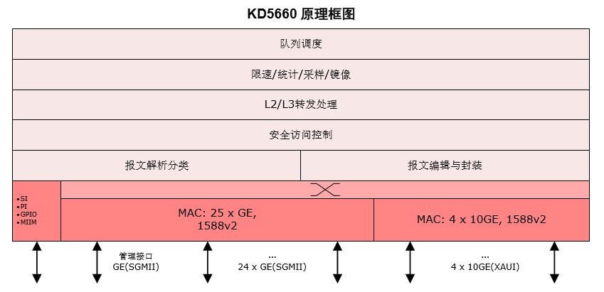 KD5660 是國內首款實現芯片前端設計、后端設計、仿真驗證、芯片制造、封裝與測試全流 程在國內自主研制完成的 64Gbps 安全以太網交換芯片,可應用在園區網絡和城域以太網絡接入 /匯聚場景。