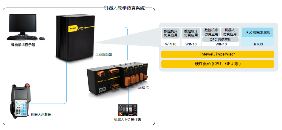 其中,工業服務器上裝載Intewell操作系統,通過虛擬化的方式將設備分為一個實時核和多個非實時核,實時核部分運行PLC控制器應用,非實時核部分運行控機床仿真應用、機器人仿真應用、PLC編程應用等軟件,同時虛擬化支持顯卡透傳,支持屏幕分割為多個小窗口,方便用戶將多個應用平鋪在一個屏幕中,從而實現一臺設備完成了原有的多臺高性能工控機及一個控制器等多個物理設備所完成的任務,達到教學設備的一體化展示及成本的降低。
