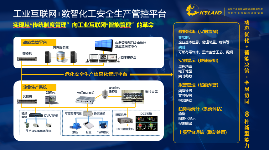 東土科技工業互聯網+數智化工安全生產管控平臺企業端,全面整合人員管理、生產管理、設備管理等6大危化生產要素,通過實現快速感知、實時監測、超前預警等8大新型能力,基于5G、AR、AI等多種新型技術和多種終端應用,以雙重預防機制為核心,通過推動操作控制智能化、風險預警精準化、危險作業無人化、運維輔助遠程化,全面提升安全管理可知、可視、可溯,可控的綜合效能,可大幅提升企業安全生產信息化、數字化,智能化水平。