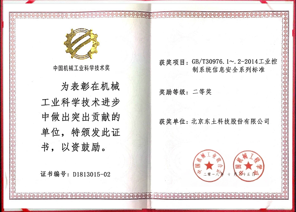 東土科技參與制定的“GB/T30976.1~.2-2014工業(yè)控制系統(tǒng)信息安全系列標(biāo)準(zhǔn)”榮獲中國(guó)機(jī)械工業(yè)科學(xué)技術(shù)獎(jiǎng)二等獎(jiǎng)。