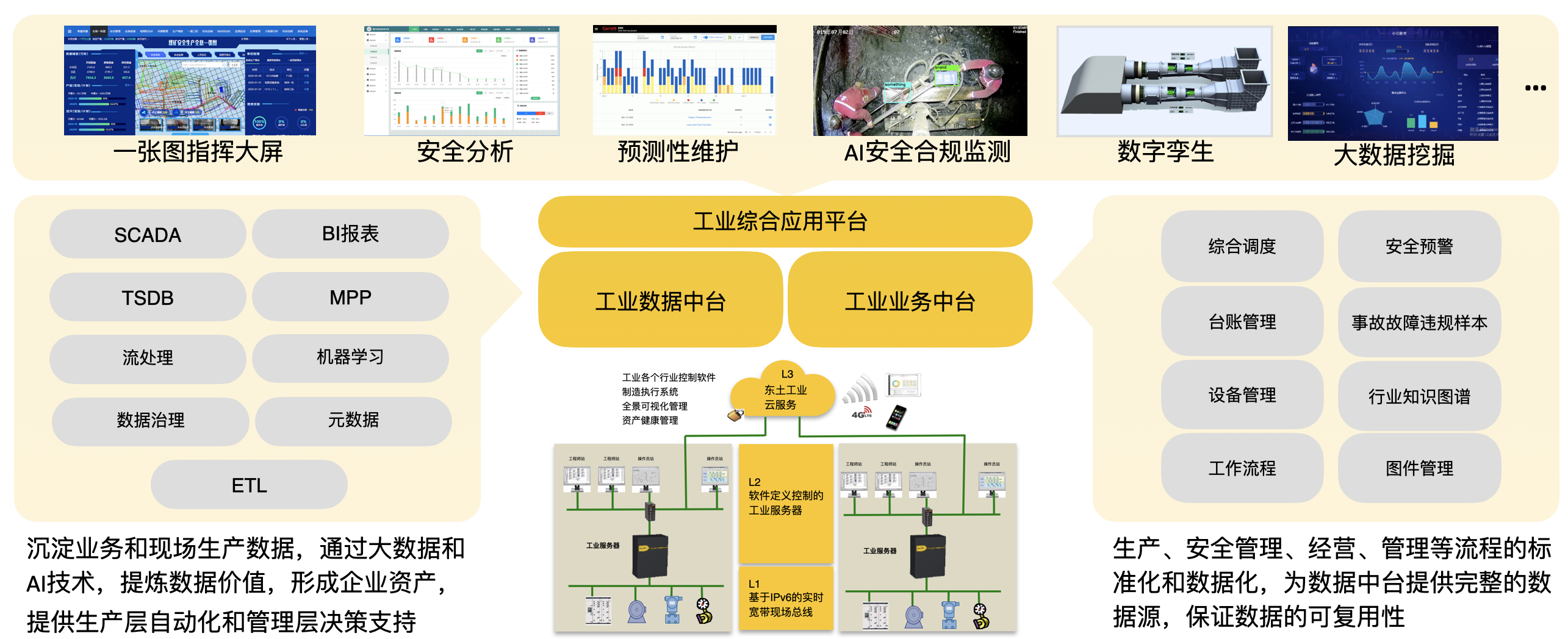 基于獨有的工業大數據分析處理技術,高效采集及處理海量工業實時數據、安全監測數據、業務數據和視頻大數據。將數據轉換為企業資產,通過數據建模、數據服務和數據分析,為各層級人員提供可靠的決策支持。