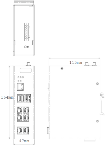 | 機械結構 | 外殼:金屬 重量:1.17kg(導軌式); 5.5kg-7kg(機架式) 尺寸(WxHxD): 47mm×164mm×115mm(導軌式) 440mm×44mm×440mm(機架式4GX6GE) 435mm×44mm×360mm(機架式2GX6GE) 440mm×44mm×440mm(機架式4GX14GE) 435mm×44mm×400mm(機架式4GX7GE) IP等級:IP40(導軌式);IP40(機架式) 散熱方式:無風扇自然散熱 安裝方式:導軌安裝(導軌式);1U機架安裝(機架式) |