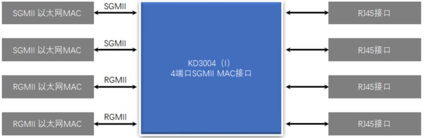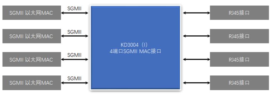 在SGMII應(yīng)用模式下,KD3004是一個四端口SGMII MAC電口收發(fā)器。