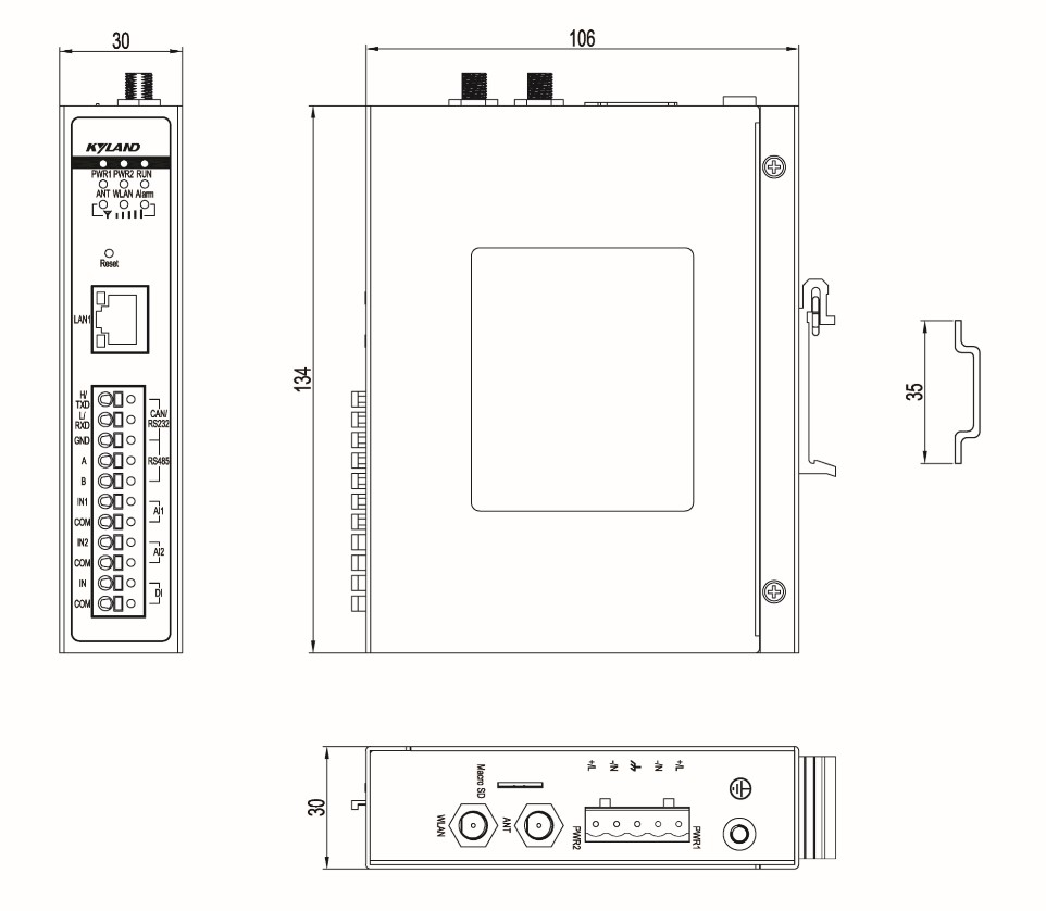 | 指示燈 | 前面板指示燈 運行指示燈:Run 告警指示燈:Alarm 電源指示燈:PWR1,PWR2 網絡:ACT/LINK 無線工作狀態指示燈:ANT,信號強弱指示燈 |
