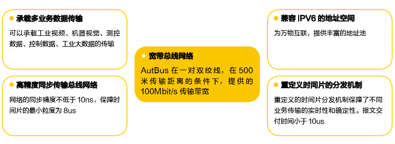 AUTBUS 是一種采用兩線非橋接媒介,具有多節點、高帶寬、高實時、可 遠距離傳輸的工業現場總線。總線數據帶寬達到 100Mbps,最大傳輸距離 500 米,最小循環周期 8 微秒,最大節點數 256 個,傳輸誤碼率優于 10-11,總線 時鐘抖動 10ns,同時支持總線虛擬化和非對稱加密。AUTBUS 用于過程控制和離散控制等自動化控制工業現場的實時數據和非實時數據的傳輸與應用,兼容 ISO/IEC/IEEE 8802-3 以太網、IPv6 等應用。